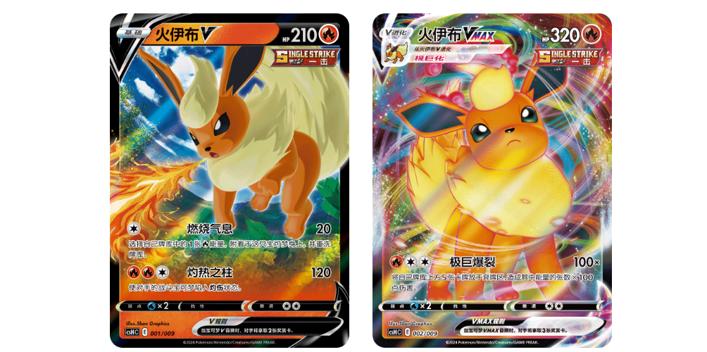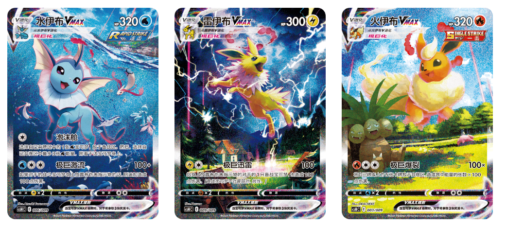Meanwhile, the special illustration holo cards of Vaporeon VMAX, Jolteon VMAX and Flareon VMAX are also included respectively. The charming poses of the Eeveelutions leap off the cards—experience their Gigantamax charm!